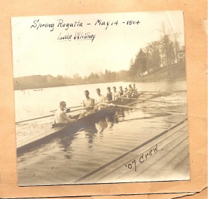 Based on the volume of what he included in his scrapbook, Kruttschnitt was most proud of being coxswain on the Yale rowing team of eight, the top squad at Yale, during his junior and senior years. This may not sound like a big deal today, but it was huge at Yale in the early 1900s. Crew was an important tradition at Yale. Fifty-odd years before Kruttschnitt got to Yale, the crew teams of Harvard and Yale faced off in the first competition between American colleges. The rivals met on August 3, 1852 in a two-mile race on New Hampshire’s Lake Winnipesaukee.